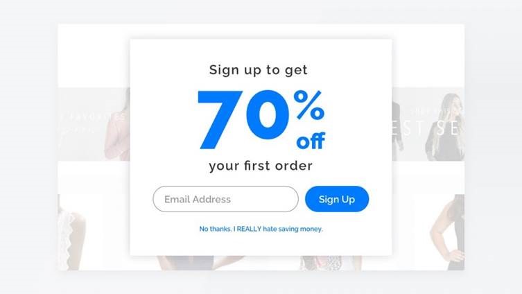 - Generates a pop-up window in which you are asked to enter your email address, and highlights the "send" button to receive, for example, a discount or other intriguing information.