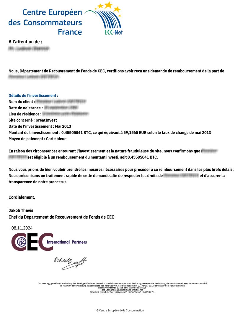 Les fraudeurs contactent par téléphone et/ou par e-mail les consommateurs en prétendant représenter le CEC France. Ils leur proposent ses services payants pour obtenir le remboursement du montant investi en bitcoins sur un site indiqué comme frauduleux. Ils adressent ensuite un e-mail aux consommateurs, en utilisant le nom et le logo du CEC France avec en pièce jointe une copie de la lettre qu’ils auraient adressée au site d’investissement. Ces lettres sont co-signées du nom des responsables actuels du CEC France et du Centre Européen de la Consommation.